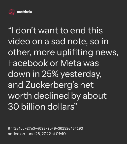 π€ share“I don’t want to end this video on a sad note, so in other, more uplifiting news, Facebook or Meta was down in 25% yesterday, and Zuckerberg’s net worth declined by about 30 billion dollars”