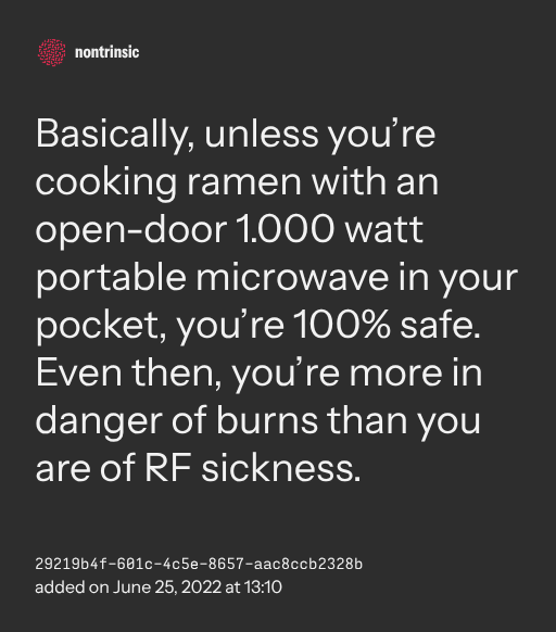 π€ shareBasically, unless you’re cooking ramen with an open-door 1.000 watt portable microwave in your pocket, you’re 100% safe. Even then, you’re more in danger of burns than you are of RF sickness.