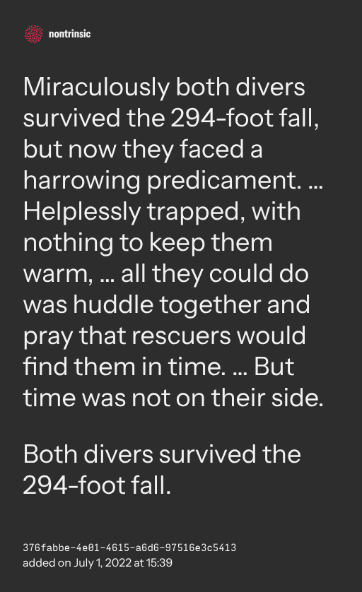 π€ shareMiraculously both divers survived the 294-foot fall, but now they faced a harrowing predicament. … Helplessly trapped, with nothing to keep them warm, … all they could do was huddle together and pray that rescuers would find them in time. … But time was not on their side.