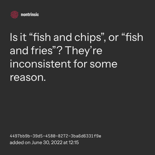 π€ shareIs it “fish and chips”, or “fish and fries”? They’re inconsistent for some reason.
