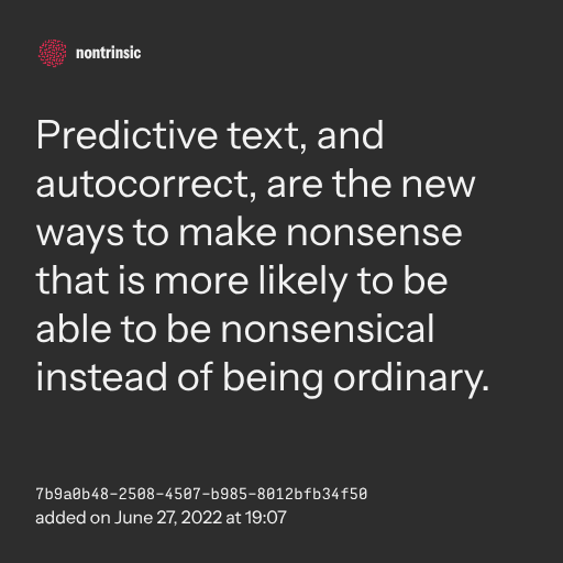 π€ sharePredictive text, and autocorrect, are the new ways to make nonsense that is more likely to be able to be nonsensical instead of being ordinary.