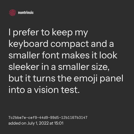 π€ shareI prefer to keep my keyboard compact and a smaller font makes it look sleeker in a smaller size, but it turns the emoji panel into a vision test.