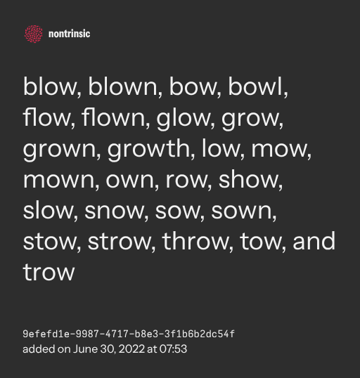 π€ shareblow, blown, bow, bowl, flow, flown, glow, grow, grown, growth, low, mow, mown, own, row, show, slow, snow, sow, sown, stow, strow, throw, tow, and trow