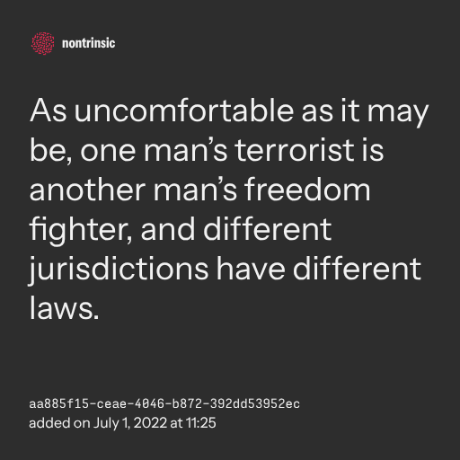π€ shareAs uncomfortable as it may be, one man’s terrorist is another man’s freedom fighter, and different jurisdictions have different laws.