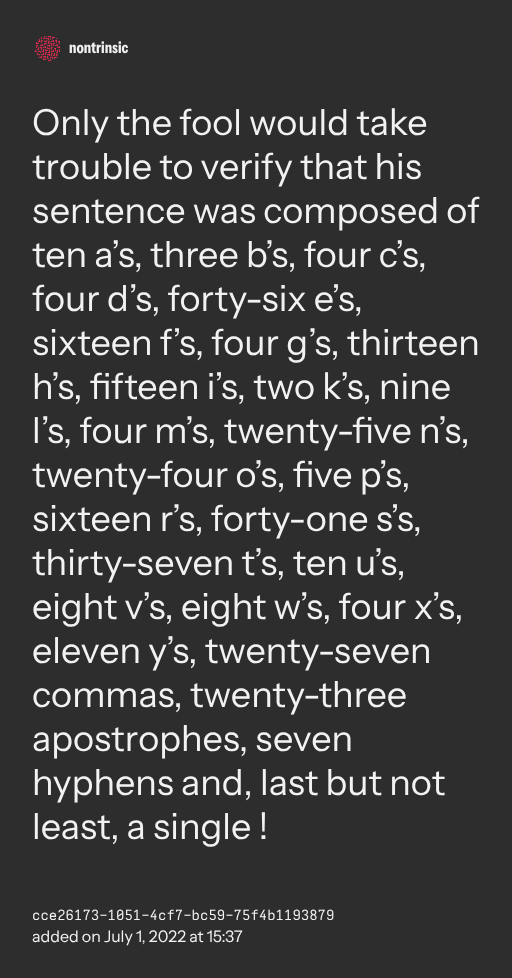 π€ shareOnly the fool would take trouble to verify that his sentence was composed of ten a’s, three b’s, four c’s, four d’s, forty-six e’s, sixteen f’s, four g’s, thirteen h’s, fifteen i’s, two k’s, nine l’s, four m’s, twenty-five n’s, twenty-four o’s, five p’s, sixteen r’s, forty-one s’s, thirty-seven t’s, ten u’s, eight v’s, eight w’s, four x’s, eleven y’s, twenty-seven commas, twenty-three apostrophes, seven hyphens and, last but not least, a single !