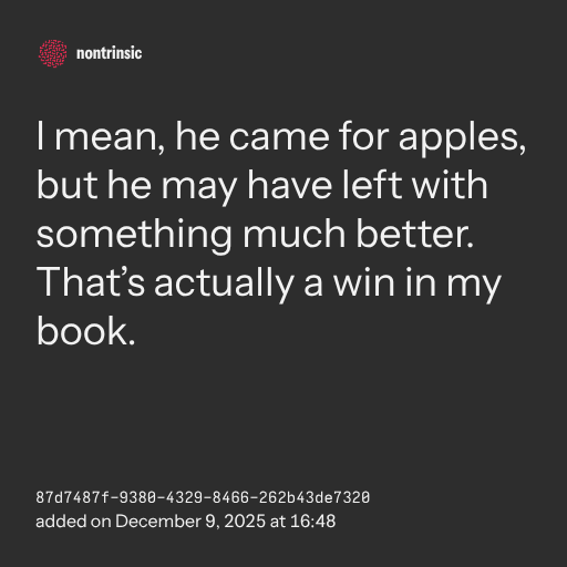 partagerI mean, he came for apples, but he may have left with something much better. That’s actually a win in my book.