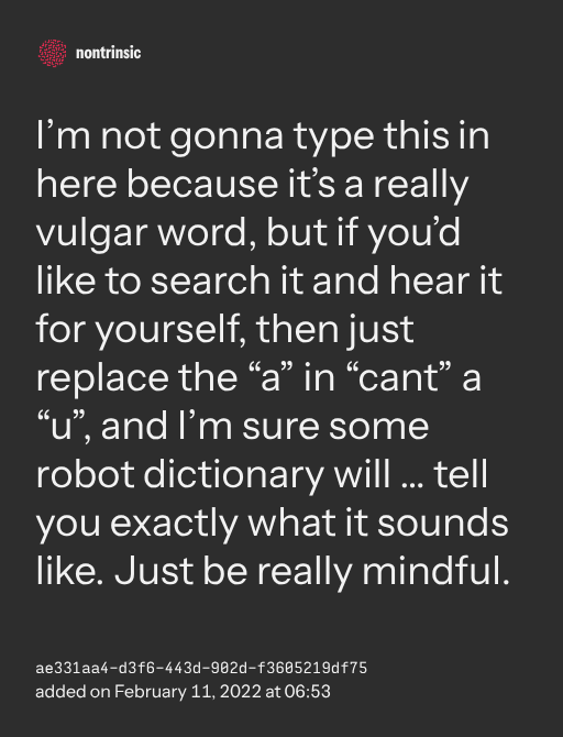 partagerI’m not gonna type this in here because it’s a really vulgar word, but if you’d like to search it and hear it for yourself, then just replace the “a” in “cant” a “u”, and I’m sure some robot dictionary will … tell you exactly what it sounds like. Just be really mindful.