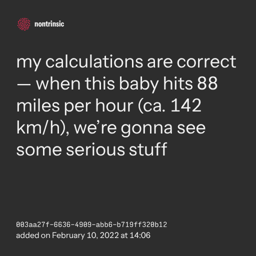 partagermy calculations are correct — when this baby hits 88 miles per hour (ca. 142 km/h), we’re gonna see some serious stuff