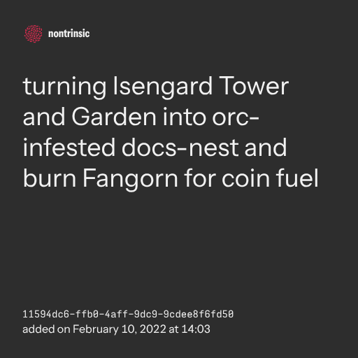 partagerturning Isengard Tower and Garden into orc-infested docs-nest and burn Fangorn for coin fuel