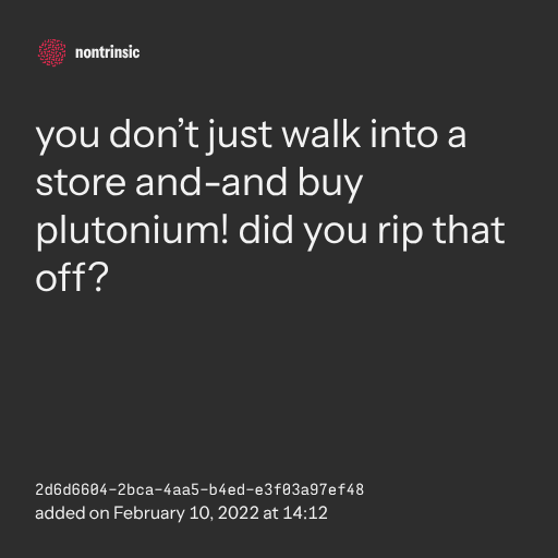 partageryou don’t just walk into a store and-and buy plutonium! did you rip that off?