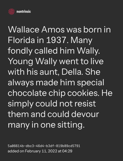 partagerWallace Amos was born in Florida in 1937. Many fondly called him Wally. Young Wally went to live with his aunt, Della. She always made him special chocolate chip cookies. He simply could not resist them and could devour many in one sitting.