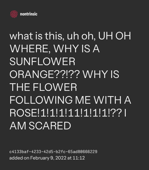partagerwhat is this, uh oh, UH OH WHERE, WHY IS A SUNFLOWER ORANGE??!?? WHY IS THE FLOWER FOLLOWING ME WITH A ROSE!1!1!1!11!1!1!1!?? I AM SCARED
