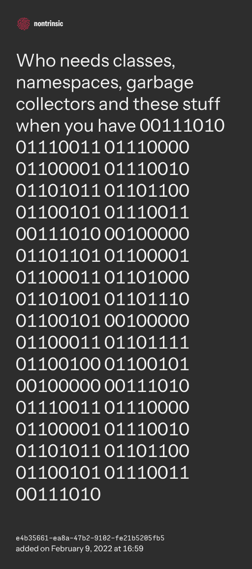 partagerWho needs classes, namespaces, garbage collectors and these stuff when you have 00111010 01110011 01110000 01100001 01110010 01101011 01101100 01100101 01110011 00111010 00100000 01101101 01100001 01100011 01101000 01101001 01101110 01100101 00100000 01100011 01101111 01100100 01100101 00100000 00111010 01110011 01110000 01100001 01110010 01101011 01101100 01100101 01110011 00111010
