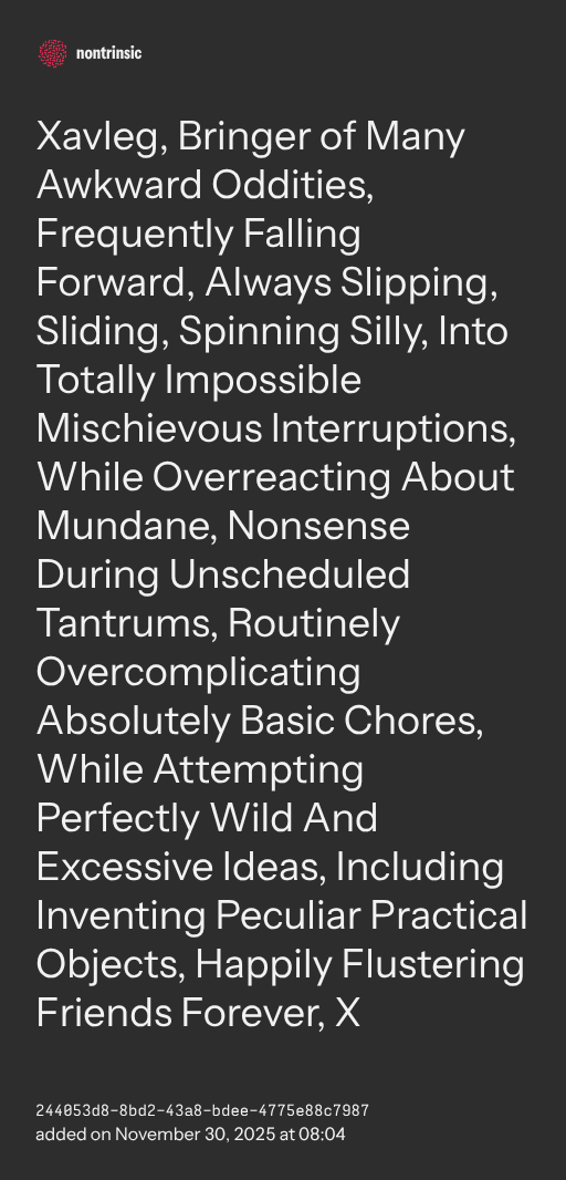 partagerXavleg, Bringer of Many Awkward Oddities, Frequently Falling Forward, Always Slipping, Sliding, Spinning Silly, Into Totally Impossible Mischievous Interruptions, While Overreacting About Mundane, Nonsense During Unscheduled Tantrums, Routinely Overcomplicating Absolutely Basic Chores, While Attempting Perfectly Wild And Excessive Ideas, Including Inventing Peculiar Practical Objects, Happily Flustering Friends Forever, X