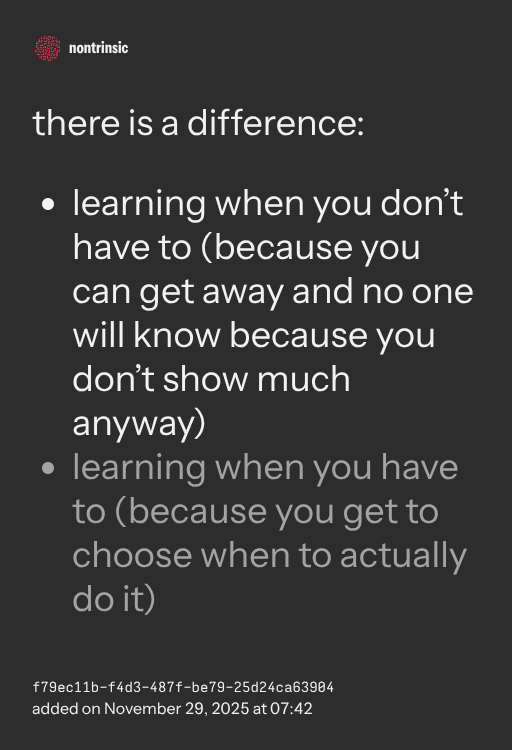- learning when you don’t have to (because you can get away and no one will know because you don’t show much anyway)