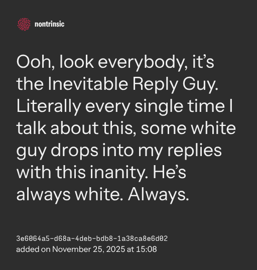 partagerOoh, look everybody, it’s the Inevitable Reply Guy. Literally every single time I talk about this, some white guy drops into my replies with this inanity. He’s always white. Always.