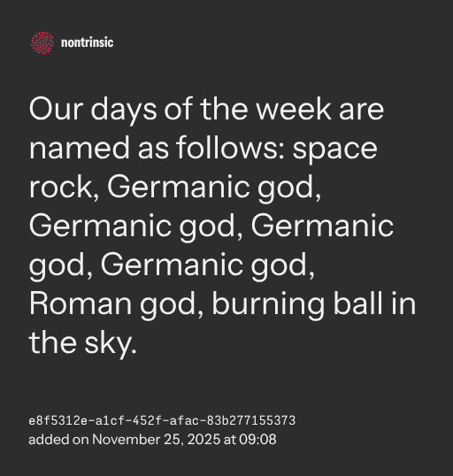 partagerOur days of the week are named as follows: space rock, Germanic god, Germanic god, Germanic god, Germanic god, Roman god, burning ball in the sky.