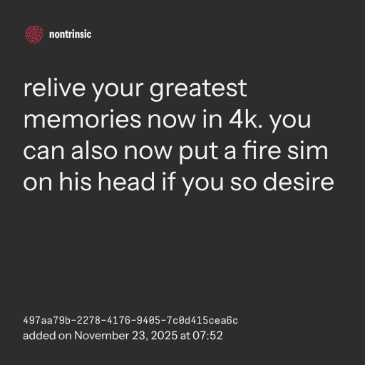 partagerrelive your greatest memories now in 4k. you can also now put a fire sim on his head if you so desire
