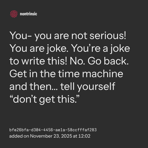 partagerYou- you are not serious! You are joke. You’re a joke to write this! No. Go back. Get in the time machine and then… tell yourself “don’t get this.”