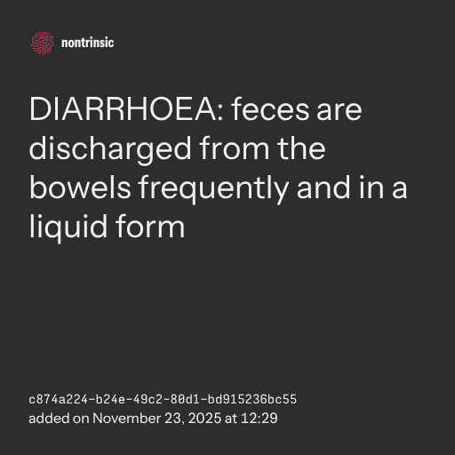 partagerDIARRHOEA: feces are discharged from the bowels frequently and in a liquid form