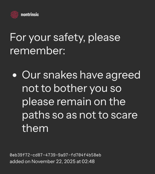 - Our snakes have agreed not to bother you so please remain on the paths so as not to scare them