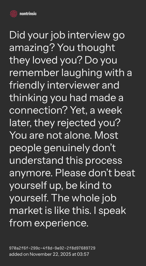 partagerDid your job interview go amazing? You thought they loved you? Do you remember laughing with a friendly interviewer and thinking you had made a connection? Yet, a week later, they rejected you? You are not alone. Most people genuinely don’t understand this process anymore. Please don’t beat yourself up, be kind to yourself. The whole job market is like this. I speak from experience.