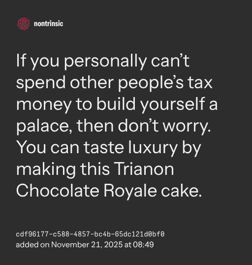 partagerIf you personally can’t spend other people’s tax money to build yourself a palace, then don’t worry. You can taste luxury by making this Trianon Chocolate Royale cake.