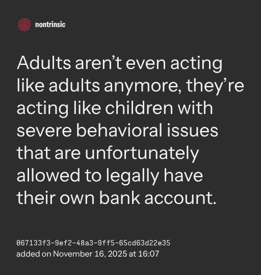 partagerAdults aren’t even acting like adults anymore, they’re acting like children with severe behavioral issues that are unfortunately allowed to legally have their own bank account.