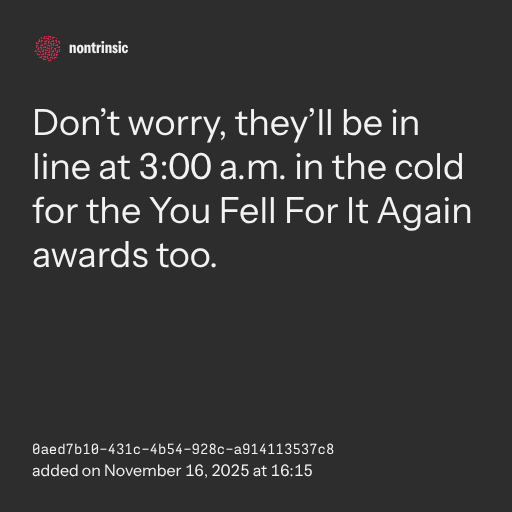 partagerDon’t worry, they’ll be in line at 3:00 a.m. in the cold for the You Fell For It Again awards too.