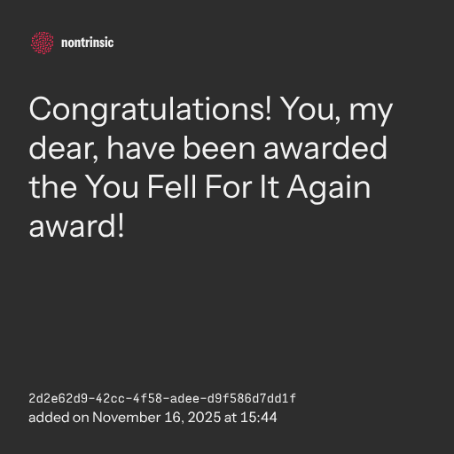 partagerCongratulations! You, my dear, have been awarded the You Fell For It Again award!