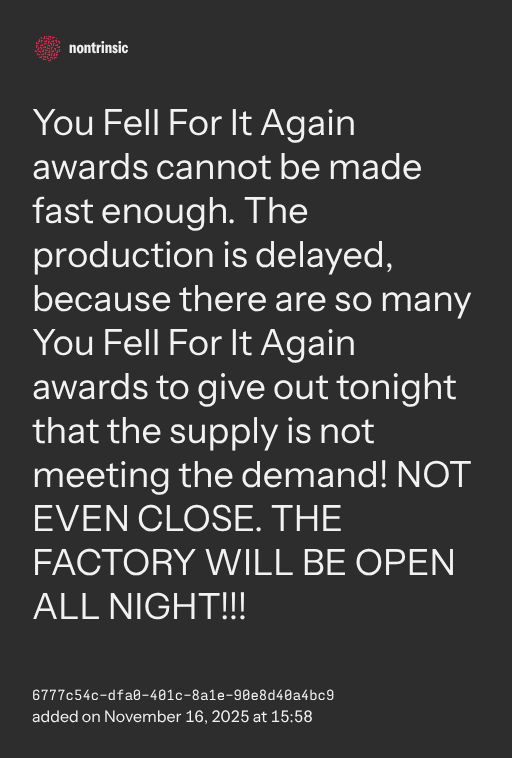 partagerYou Fell For It Again awards cannot be made fast enough. The production is delayed, because there are so many You Fell For It Again awards to give out tonight that the supply is not meeting the demand! NOT EVEN CLOSE. THE FACTORY WILL BE OPEN ALL NIGHT!!!