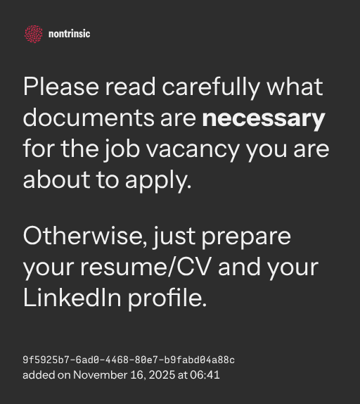 partagerPlease read carefully what documents are necessary for the job vacancy you are about to apply.