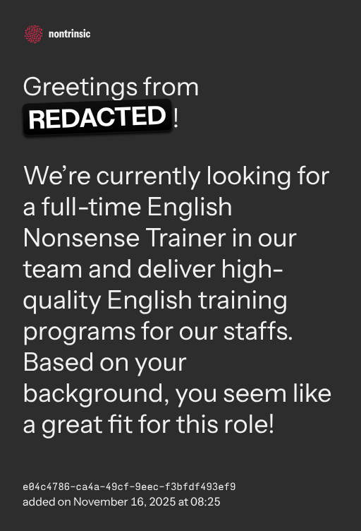 We’re currently looking for a full-time English Nonsense Trainer in our team and deliver high-quality English training programs for our staffs. Based on your background, you seem like a great fit for this role!