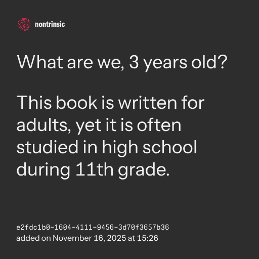 This book is written for adults, yet it is often studied in high school during 11th grade.