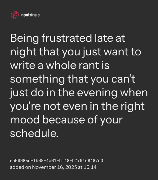 partagerBeing frustrated late at night that you just want to write a whole rant is something that you can’t just do in the evening when you’re not even in the right mood because of your schedule.