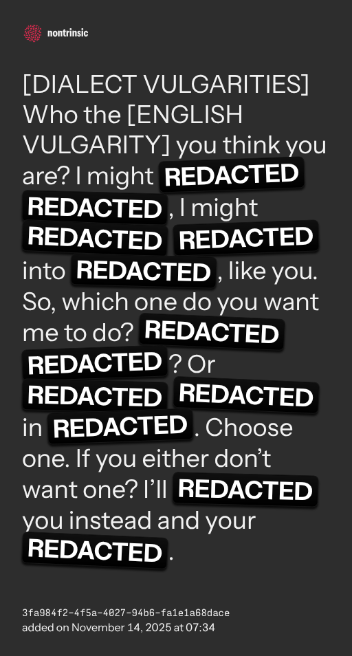 partager[DIALECT VULGARITIES] Who the [ENGLISH VULGARITY] you think you are? I might REDACTED REDACTED, I might REDACTED REDACTED into REDACTED, like you. So, which one do you want me to do? REDACTED REDACTED? Or REDACTED REDACTED in REDACTED. Choose one. If you either don’t want one? I’ll REDACTED you instead and your REDACTED.
