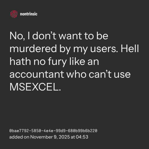 partagerNo, I don’t want to be murdered by my users. Hell hath no fury like an accountant who can’t use MSEXCEL.