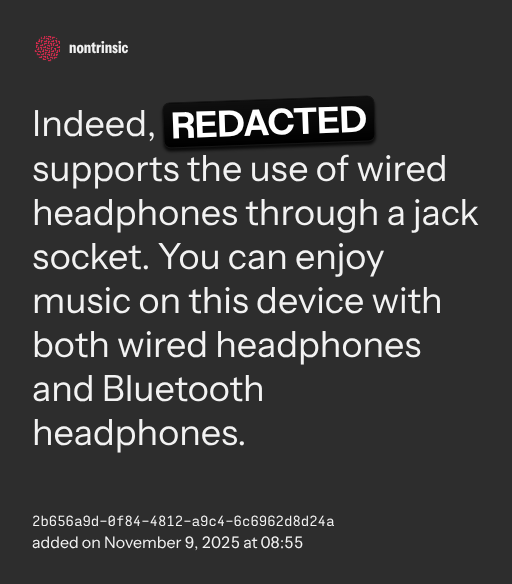 partagerIndeed, REDACTED supports the use of wired headphones through a jack socket. You can enjoy music on this device with both wired headphones and Bluetooth headphones.