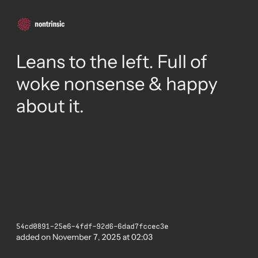 partagerLeans to the left. Full of woke nonsense & happy about it.