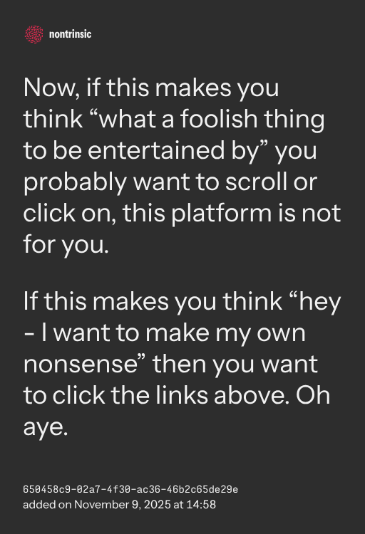If this makes you think “hey - I want to make my own nonsense” then you want to click the links above. Oh aye.