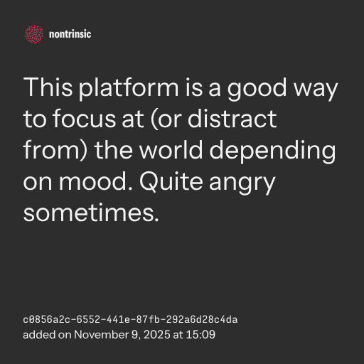 partagerThis platform is a good way to focus at (or distract from) the world depending on mood. Quite angry sometimes.