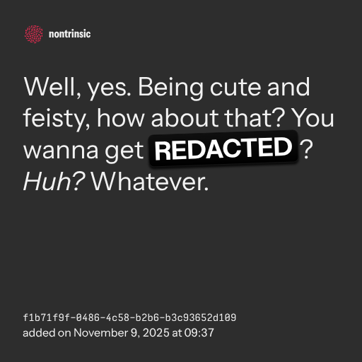 partagerWell, yes. Being cute and feisty, how about that? You wanna get REDACTED? Huh? Whatever.