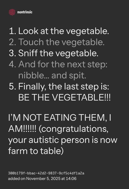 I’M NOT EATING THEM, I AM!!!!!! (congratulations, your autistic person is now farm to table)