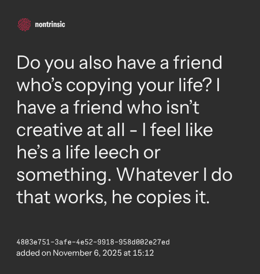 Do you also have a friend who’s copying your life? I have a friend who isn’t creative at all - I feel like he’s a life leech or something. Whatever I do that works, he copies it.