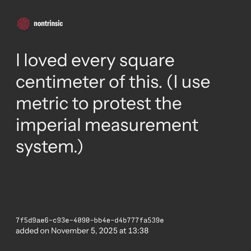 partagerI loved every square centimeter of this. (I use metric to protest the imperial measurement system.)