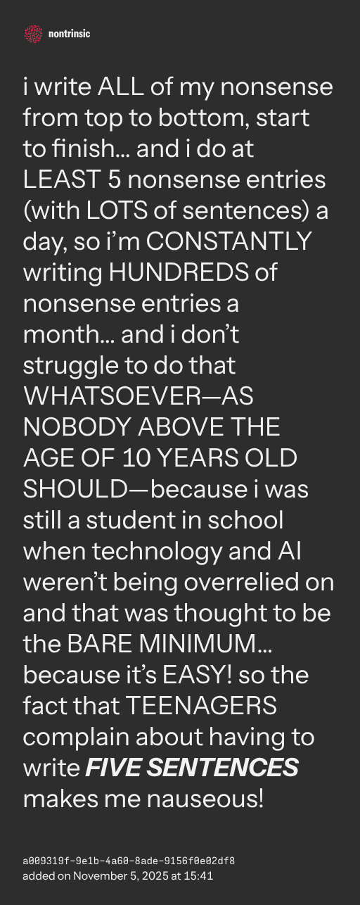partageri write ALL of my nonsense from top to bottom, start to finish… and i do at LEAST 5 nonsense entries (with LOTS of sentences) a day, so i’m CONSTANTLY writing HUNDREDS of nonsense entries a month… and i don’t struggle to do that WHATSOEVER—AS NOBODY ABOVE THE AGE OF 10 YEARS OLD SHOULD—because i was still a student in school when technology and AI weren’t being overrelied on and that was thought to be the BARE MINIMUM… because it’s EASY! so the fact that TEENAGERS complain about having to write FIVE SENTENCES makes me nauseous!