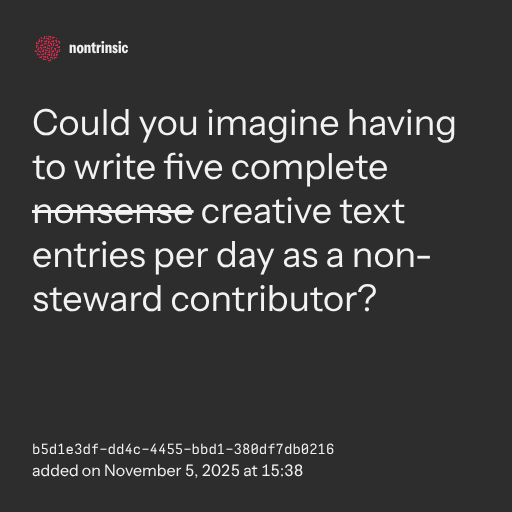 partagerCould you imagine having to write five complete nonsense creative text entries per day as a non-steward contributor?