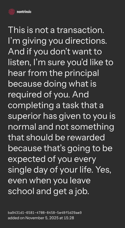 partagerThis is not a transaction. I’m giving you directions. And if you don’t want to listen, I’m sure you’d like to hear from the principal because doing what is required of you. And completing a task that a superior has given to you is normal and not something that should be rewarded because that’s going to be expected of you every single day of your life. Yes, even when you leave school and get a job.