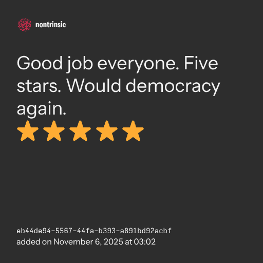 partagerGood job everyone. Five stars. Would democracy again.