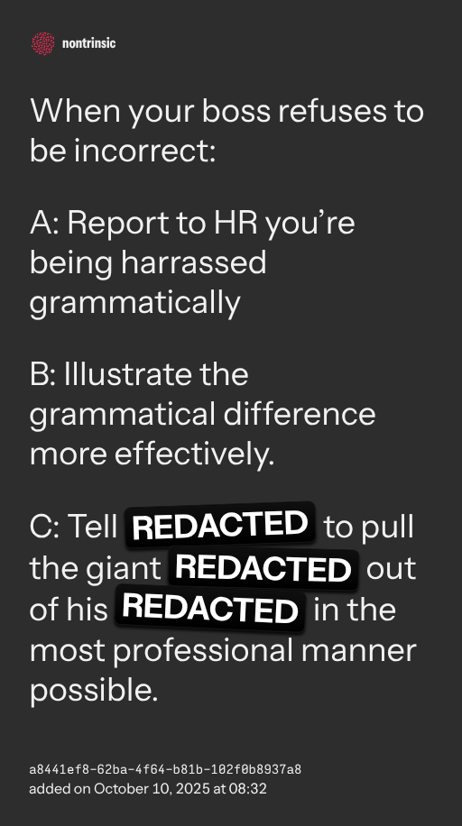 C: Tell REDACTED to pull the giant REDACTED out of his REDACTED in the most professional manner possible.